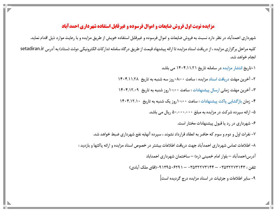 شهرداری احمدآباد در نظر دارد نسبت به فروش ضایعات و اموال فرسوده و غير قابل استفاده خویش از طریق مزایده اقدام نمایید.کلیه مراحل برگزاری مزایده، از دریافت اسناد مزایده تا ارائه پیشنهاد قیمت از طریق درگاه سامانه تدارکات الکترونیکی دولت(ستاد)...